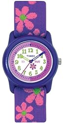 Help teach your child to tell time with the Timex T89022 Time Teacher watch, which features labeled and color-differentiated hour and minute hands and a color differentiated dial with "to" and "past" markings. This quartz analog watch features a small flower that rotates around the dial with the hands and a comfortable elastic fabric strap (for better dirt and stain resistance) with pink flowers against a purple base. This watch also offers water resistance to 30 meters (99 feet), durable purple resin case, and Timex's unique Kids Loss Protection Plan. It's recommended for children ages 6 and older.