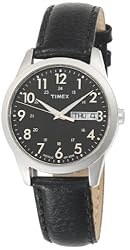 Cool tones and a sleek design define this Men's Analog Watch from Timex. Framed by a smooth, silver-tone bezel, the round, black dial features crisp, silver-tone Arabic numerals marking the hours, an inner 24-hour track, and super-luminous, silver-tone outlined, sun-ray hands. A convenient outside minute track helps with detailed time telling, and a day and date display sits just inside three o'clock. The lightly patterned, black leather strap is accented with detail stitching and fastens with a traditional buckle for a comfortable fit. Match this elegant timepiece to your outfit with the added versatility of a second brown leather strap. This fashionable timepiece is evenly backlit with Indiglo for better nighttime viewing, and with a water resistant depth of 99 feet (30 meters), you can confidently wear this versatile timepiece with dress or professional wear.