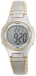 An elegant choice for work wear or dressy ensembles, the Timex Classic Digital Expansion Band Watch for women features two-toned styling. This digital watch has a round, grey display, durable mineral crystal window, and sturdy brass case and bezel. Other features include a 12- and 24-hour format, date, chronograph, countdown timer, and daily alarm with five-minute back-up. You'll be able to read the time in low-light environments with the Indiglo nightlight function. The silver-toned stainless steel watch has gold-toned trim around the dial, on the pushers, and along the expansion bracelet. This Timex women's watch relies on trusted quartz movement and is water resistant up to 99 feet (30 meters).