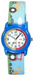 The popular Timex kid's Time Teacher Blue Tractors watch continues to be one of the most kid-friendly watches around. Its durable design gives this watch the capability to withstand rough wear, and its innovative features cater to your child's creativity. This watch, which is water resistant up to 99 feet, is powered by analog-quartz movement. Easy-to-read Arabic numerals and a stylized mini-tractor embellish the classic white dial face, and the case is glossy blue. A steadfast buckle clasp accompanies the charming canvas band, which features an array of multi-colored tractors. Learning to tell time has never been so much fun.