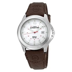 Designed for active, outdoor lifestyles--as well as the rigors of harsh urban landscapes--the full-sized Timex T44381 Expedition stainless steel watch adds a stylish yet rugged complement to your everyday wear. It features a large, round silver stainless steel watch case with flattened, brushed bezel that frames a white dial background with Arabic numerals, inset 24-hour notations in red, large, luminous stick hands (with seconds hand), and a date display at 3 o'clock. With the Quick Date function, you can set the date on the watch without turning the crown for every 24-hour period. Just pull the stem halfway out, and turn until desired date is reached. It also offers an 8-year battery life, water resistance to 50 meters (165 feet), and a genuine leather strap in brown.