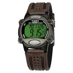 Designed for active, outdoor lifestyles--as well as the rigors of harsh urban landscapes--the mid-sized Timex T48042 Expedition digital watch adds a stylish yet rugged complement to your everyday wear. It features a round resin watch case in black with an olive green top ring and a water-resistant leather strap in brown with black mesh lining. Timing features include a 100-hour chronograph with lap or split options, 99-lap counter, 24-hour countdown timer, and second time zone with date. It also offers three alarms with daily, weekday, and weekend options, and water resistance to 100 meters (330 feet).