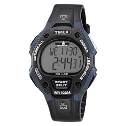 Keep your sports training focused with this full-sized, shock-resistant Timex Ironman Triathlon multi-function sport digital watch (model T5H591), which features a 30-lap memory, a durable blue and black resin case, large buttons for easy access to timing functions, and a comfortable polyurethane strap. It also offers water resistance to 100 meters (330 feet), three alarms (with 5-minute backup), and three time zones. Other features include a top pusher for easy access to lap and split times, an occasion mode to set reminders for birthdays, anniversaries, holidays and appointments, and all-day white reflector display. Sport timing functions include: