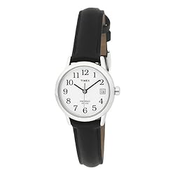 Fashionable for any occasion, the Timex T2H331 silver-tone stainless steel watch features an easily readable dial with mid Arabic numeral display against a classic white dial background. It offers a mid-sized, round watch case with slightly raised bezel and a supple, genuine leather strap in black. It also features water resistance to 30 meters (99 feet), and date display at 3 o'clock. With the Quick Date function, you can set the date on the watch without turning the crown for every 24-hour period. Just pull the stem halfway out, and turn until desired date is reached.