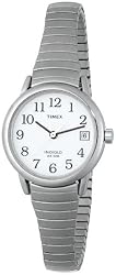 A stainless steel expansion bracelet and stainless steel bezel make the Timex women's EZ Reader expansion watch suitable for any occasion. Featuring a white dial, with black Arabic numerals, a date display at 3 o'clock, and an Indiglo night light, the EZ Reader offers both style and convenience. It is powered by precise analog-quartz movement and protected by a mineral dial window. This timepiece is also water resistant to a depth of 99 feet.