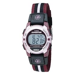 The Timex Women's Expedition Chronograph Watch #T49659 enhances the outdoor experience with its blend of classic design and advanced technology. And with its handy chronograph feature, this timepiece delivers on-demand information at the click of a button. A stationary polyurethane bezel and durable acrylic window encase and protect the digital-gray dial face. Accented with attractive maroon highlights, the 33-millimeter case is made of rubber, and the sporty canvas band and buckle clasp ensure grace and comfort. Other features include its day, date, and month calendar. It's water resistant up to 330 feet. This watch is powered by digital-quartz movement.