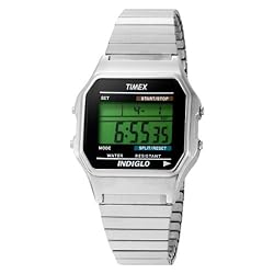 With its classic, green digital face framed in black, the Timex Men's Classic Digital Silver-Tone Watch #T78582 offers plenty of retro appeal as well as straightforward functionality. It includes an "Indiglo" night-light, chronograph, alarm, and timer, as well as a month/day/date calendar. A stainless steel expansion band brings a touch of durable class. The timepiece is water resistance up to 99 feet.