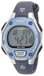 The Timex Midsize/Unisex Ironman 30 Lap Watch allows you to prepare for a tough race with an equally tough timepiece. The watch is constructed with a lightweight plastic case, a stationary blue plastic bezel, and a strong, gray resin wristband with an adjustable buckle clasp for a personalized fit. A durable mineral window shields the digital-gray dial face, which displays the time as well as the day and date. Four buttons decorate the bezel--mode, stop/reset, Indiglo, and set/recall--while a prominent start/split button rests below the six o'clock position and tracks up to 30 laps. This athletic timepiece is powered by digital-quartz movement and is water resistant to 330 feet.