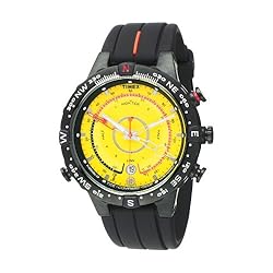 Pairing high-tech functionality with a colorful, sporty design, the Timex Men's E-Instruments TM Black Case and Resin Strap E-Tied-Temp-Compass Expedition Watch packs everything you'd need in a timepiece to suit your active, adventurous lifestyle. The bright yellow dial is loaded with features--a temperature function, tide display, chronograph, calendar, and temperature display in both Celsius and Fahrenheit, . A compass is engraved into the black ion-plated, stainless steel bezel and the entire dial is still illuminated in the dark by the indiglo night-light. An ultra-durable, black rubber bracelet is secured with a buckle clasp. It's an indispensable watch for camping and hiking, plus it can hold its own in the concrete jungle. Featuring precise quartz movement, the Timex Men's E-Instruments TM Black Case and Resin Strap E-Tied-Temp-Compass Expedition Watch is water resistant to 330 feet (100 meters).
