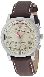 The rugged Timex Men's Expedition E-Compass Analog Watch is equally useful in the outdoors or in the office. The round, ivory dial features an electronic compass on the outer perimeter with a distinctive, silver-toned fourth hand. The luminous, silver-toned hour and minute hands, along with a red second hand, point to luminous, bar-shaped hour indexes and silver-toned, Arabic numeral hour indexes at three, six, nine, and twelve o'clock. The hours are also marked with 24-hour function indexes and complement the printed minute track and date display. Plus, the Indiglo night-light allows you to view the dial in even low-light conditions, and the dial is protected by a mineral crystal window. The stainless steel bezel and case offer durability and strength. For a refined look, the brown watch strap is made from soft, calfskin leather for comfort and style. The timepiece is equipped with reliable quartz movement and features water resistance to 330 feet (100 meters).