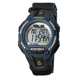Ideal for both casual and high-performance athletes, the Timex Ironman 30-Lap Sports Watch is a trendy, durable watch with a top push button for easy operation. With a wide variety of useful functions including a daily/weekday/weekend alarm, 30-lap memory recall, 99-lap counter, 24-hour countdown timer, and stopwatch with lap and split times, this sports watch is also water resistant to 330 feet (100 meters). A stylishly contoured resin case backgrounds the blue bezel with Allen screw accents, and this Ironman watch wraps smoothly and comfortably around the wrist, fastening with a handy and secure Velcro fold-over clasp. The digital dial with Indiglo night light can be read in any light conditions and offers a month, day, and date display along with the option for three different time zones.