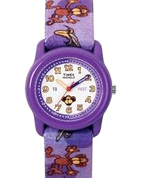 The popular Timex kid's Time Teacher Purple Monkey watch continues to be one of the most kid-friendly watches around. Its durable design gives this watch the capability to withstand rough wear, and its innovative features cater to your child's creativity. Easy-to-read Arabic numerals and an adorable, stylized monkey embellish the classic white dial face, and the case is glossy purple. A steadfast buckle clasp accompanies the charming canvas band, which features a whimsical array of bananas and lovable monkeys. This watch, which is water resistant up to 99 feet, is powered by analog-quartz movement. Learning to tell time has never been so much fun. This watch is backed by a 1-year manufacturer's warranty.