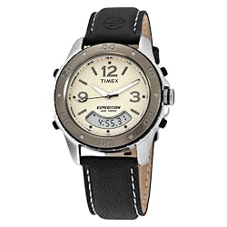 Designed for active, outdoor lifestyles--as well as the rigors of harsh urban landscapes--the full-sized Timex T41361 Expedition analog/digital watch adds a stylish yet rugged complement to your everyday wear. It features a 24-hour chronograph with lap and split timing options, 24-hour countdown timer, alarm, and three time zones. The silver stainless steel case is toped with a silver bezel with engraved 10-minute marks that frames an off-white dial background with a mix of silver stick and Arabic numeral markings and large luminous hands (with seconds hand). It also offers water resistance to 100 meters (330 feet) and a genuine leather band in brown with white contrast stitching.