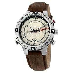 The Timex Men's Expedition E-Instruments Compass Tide Temperature Watch is a high-performance accessory for the style-conscious yachtsman or water enthusiast. The watch's dark brown leather strap is accented by contrast stitching and complements the stainless steel case and generously sized cream-colored dial. The bidirectional rotating bezel features compass directions. The dial has luminous hands for time (numbers are designated by black indexes) while a third hand alerts the user of tidal trends and current air or water temperature, and a fourth red-tipped hand always points to true north. This watch features Indiglo night light and is water resistant to 330 feet.