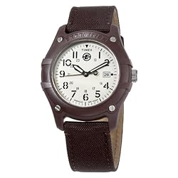 Featuring durable canvas straps and an easy-to-read face, the Timex Men's Analog Camper Canvas Strap Expedition Watch is man's best friend--at least in the great outdoors. Constructed with a lightweight resin case, the watch includes a stationary resin bezel and a brown canvas wristband secured with an adjustable buckle clasp. A tough acrylic window shields the tan dial, which features black Arabic numeral hour markers denoting both the standard time and 24-hour clock cycle. The face also includes slim minute indexes, silver-tone watch hands, an Indiglo night-light feature, and a convenient date calendar at three o'clock. Powered by quartz movement, the watch is water resistant to 330 feet (100 M).