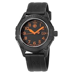 With its durable rubber strap and stainless steel case design, the Timex Men's Analog Expedition Watch is ready for the great outdoors. Both casual and athletic, this stylish all-black timepiece goes with the casual clothes you like to wear every day. The round black dial features an Indiglo night light and orange accents, including easy-to-read Arabic numeral hour markers, hands, and a date display at the three o'clock. With the Quick-Date function on the crown, the date is simple to set. Powered by precise quartz movement, this Timex is water resistant to 330 feet (100 M).