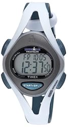 The Ironman Triathlon 50-Lap Sleek watch is stylish enough for the weekend warrior and technical enough for the extreme athlete. Equipped with a 50-lap memory chronograph, this sports timepiece also features a 100-hour chronograph with lap/split, a lap counter, three alarms, two time zones, forward or backward setting, built-in setting reminders, and an hourly chime. Perfect for night or day, the Timex has an all-day white reflector display and an Indiglo night light. This women's watch is made with a stainless steel case and a resin bezel and band. The gray dial has a digital time display and a day, date, and month calendar. Water resistant to 330 feet, the Ironman is even a great choice for swimmers and divers. It comes with two-year battery life.