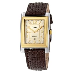 For trend setters seeking a fashion-forward timepiece, the Timex Men's Braided Leather Watch is a must-have. This striking watch, which is powered by analog-quartz movement, boldly revises a classic design by adding some modern twists. Arabic numerals complement the gold-tone dial face, and the contrasting silver- and gold-tone stainless steel case establishes a flirty, contemporary look. The watch has a sturdy buckle clasp and braided mahogany leather band, and for additional time-keeping practicality, an easy-to-read date calendar rests at the six o'clock position.