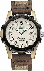 While it looks like a sturdy but casual watch, this Timex Expedition is built to excel just about anywhere you take it, as demonstrated by its most celebrated owner, Everest mountaineer Conrad Anker. The hands are illuminated, and the white dial also features the Indiglo night light function and a date calendar at the three o'clock position. Arabic numerals and full indexes allow for easy time-keeping in any situation. The strap is leather. The metal case is water resistant to 165 feet (50 meters), the black bezel is aluminum. The watch uses analog-quartz movement and is backed by a 1-year manufacturer's warranty.