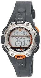 Keep your sports training focused with this mid-sized, shock-resistant Timex Ironman Triathlon multi-function sport digital watch (model 5H031), which features a 30-lap memory and the unique hands-free Flix Indiglo activation system. It features a durable dark gray resin case, silver stainless steel top ring and large buttons for easy access to timing functions. It also offers a 6-year battery life, water resistance to 200 meters (660 feet), three alarms (with 5-minute backup), and three time zones. Other features include a top pusher (in orange) for easy access to lap and split times, and all-day white reflector display. Sport timing functions include: