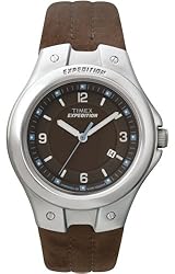 Any time, anywhere in the world. Stylish enough for casual office wear, yet durable enough to withstand all of your extreme outdoor adventures, this Timex Midsize Expedition Metal Tech Casual Watch #T49657 knows no boundaries. Powered by analog-quartz movement, this sleek timepiece features a versatile brown leather band and buckle clasp to ensure comfort and grace. The 34-millimeter brass case and stationary brass bezel beautifully offset the rich brown dial face, which is adorned with stand-out silver Arabic numerals and alternating indexes and comes protected with an ultra-resistant mineral window. For additional convenience and precision, a date calendar rests at the four-o'clock position, and contrasting minute indexes and blue glow-in-the-dark Indiglo hour indexes ring the outer face. This watch, which is water resistant to 330 feet, is backed by a 1-year manufacturer's warranty.