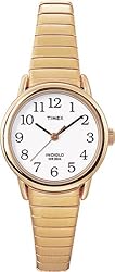 The clean white face, large Arabic numerals, and expansion wristband found on the Timex Women's Easy Reader Expansion Band Watch make it a comfortable everyday favorite. The timepiece is constructed with a stainless steel case, a stationary gold-tone metal bezel, and a gold-tone-stainless-steel expansion band for a comfortable fit. A durable mineral window protects the white dial face, which features easy-to-read black Arabic numeral hour indexes and complementary watch hands. This analog-quartz-powered timepiece is water resistant to 99 feet.