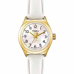 With a white leather band and a gold-tone stainless steel bezel, the Timex women's white strap watch delivers both comfort and style. Featuring a resilient mineral dial window for face protection and a tiny Indiglo night light for visibility in low light, this timepiece will be a convenient addition to your work wardrobe. In addition, it has precise analog-quartz movement and water resistance to a depth of 165 feet, and is covered by a 1-year manufacturer's warranty.