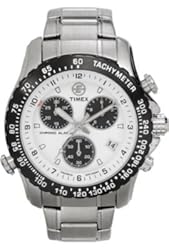 Quartz Movement, chronograph, tachymeter rotating bezel, alarm, indiglo night light, stainless steel, white dial with black sub-dials, luminous hands and markers, date window, 100 meters water resistance, 40mm.