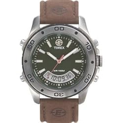 Features a metal case OD Green dial12-hour analog/digital brown leather strap Indiglo 3 time zones 24-hour countdown timer alarm and is water resistant to 100 meters.ATTRIBUTESBand:Leather StrapDial:OD Green w/DateSpecial Features:Indiglo 3 Time Zones Countdown Timer AlarmSubmersible:100 MetersType:12-Hour Analog/Digital