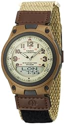 Designed to accommodate your traveling needs, the Casio Men's World Time Data Bank 10-Year-Battery Watch #AW80V-5BV features a striking cream dial face, which is protected by a sturdy mineral dial window. Stand-out Arabic numerals provide at-a-glance readability, and a surrounding ring of detailed indexes and Arabic numerals ensure precision. Other innovative features include a handy 24-hour display, a 30-page databank, a dual time-zone function, and a digital band that clearly indicates the day, date, and month. Both the 38-millimeter case and stationary bezel are made of high-quality stainless steel, and a nylon band is accompanied by a durable buckle clasp. Offsetting your look with a rugged twist, this handsome timepiece embodies your adventurous spirit. It is powered by quartz movement and is water resistant to 165 feet.