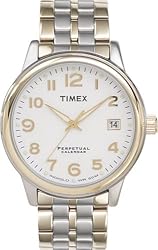 Keep up to date wherever you roam with this two-tone stainless steel Timex T2C061 Perpetual Calendar watch for men. Classically styled and a great complement to everyday business wear, this watch features a large, round gold-tone bezel and stainless steel bracelet band that mixes silver and gold-tone links. It has a white dial background with full Arabic numerals in gold. It also features luminous hands (with seconds hand) and water resistance to 50 meters (165 feet).