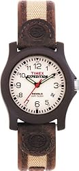 While it looks like a sturdy but casual watch, this Timex Expedition is built to excel just about anywhere you take it, as demonstrated by its most celebrated owners, Everest mountaineer Conrad Anker. The hands are illuminated, and the white dial also features the Indiglo night light function and a date calendar at the four o'clock position. Arabic numerals and full indexes allow for easy time-keeping in any situation. The strap is leather. The metal case is water resistant to 165 feet (50 meters). The watch uses analog-quartz movement and is backed by a 1-year manufacturer's warranty.