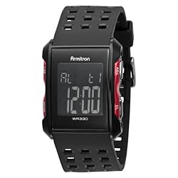 The Armitron Men's Chronograph Black and Red Digital Sport Watch is a versatile athletic accessory featuring a sleek black design as well as lap, countdown, and dual alarm functions. Designed with a lightweight black resin case, the watch includes a rectangular resin bezel and a black perforated resin wristband secured with a buckle clasp. A durable mineral window shields the digital black dial, which features the time along with a day and date display. Four red side buttons control the dual alarm, chronograph, lap, and countdown functions, as well as switch the display to military time. Powered by quartz movement, the watch is water resistant to 330 feet (100 M).