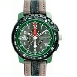 Analog compass, quartz movement, black and green dial, stainless steel case, water resistant green & beige leather strap, indiglo night light, 100 meters water reistance.