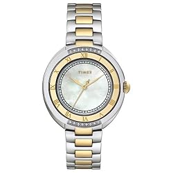 Make every day fabulous. This Timex Women's Diamond Accented Watch #T2M596 brings the extravagance of hand-selected diamonds to an affordable accessory, meant to be gorgeous, but versatile. This beautiful watch, which is powered by analog-quartz movement, comes equipped with an alternating gold- and silver-tone stainless-steel band and sturdy fold-over clasp, a 35-millimeter stainless-steel case and a steadfast mineral dial window. A lustrous mother-of-pearl dial face is adorned with stand-out minute indexes to ensure precision and clarity, and a series of embedded Roman numerals ring the dial. Embellished with shimmering stones, the stainless-steel, stationary bezel adds some sparkle. Diamonds have always been a girl's best friend, and this Timex watch features diamonds she can wear every day. This watch, which is water resistant to 99 feet, is backed by a 1-year manufacturer's warranty.